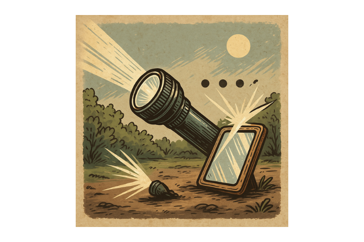 Licht ist eine der effektivsten Notfall-Kommunikationsformen, weil es Tag und Nacht funktioniert und keinerlei Infrastruktur braucht. Nachts nutzt man Taschenlampen, Stirnlampen oder sogar Kerzen; tagsüber reicht ein Spiegel, ein Metallstück oder jede glatte Oberfläche, um Sonnenlicht gezielt zu reflektieren.