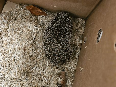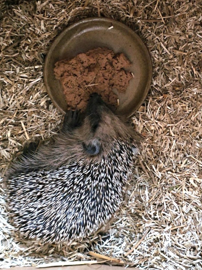 Ich habe ihn natürlich direkt mit ins Haus genommen und erst einmal versorgt. Spezielles Igel-Nassfutter besorgt, frisches Wasser hingestellt, und natürlich keine Milch - das vertragen Igel überhaupt nicht. Jetzt bekommt er regelmäßige Fütterungszeiten und seinen normalen Tag-Nacht-Rhythmus, damit er ordentlich zunehmen kann.